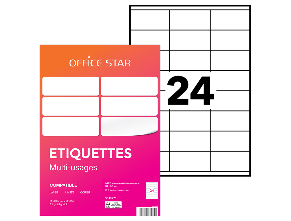 Etiquette office star impression laser jet encre et copieur 70x35mm coloris blanc pochette 2400 unites