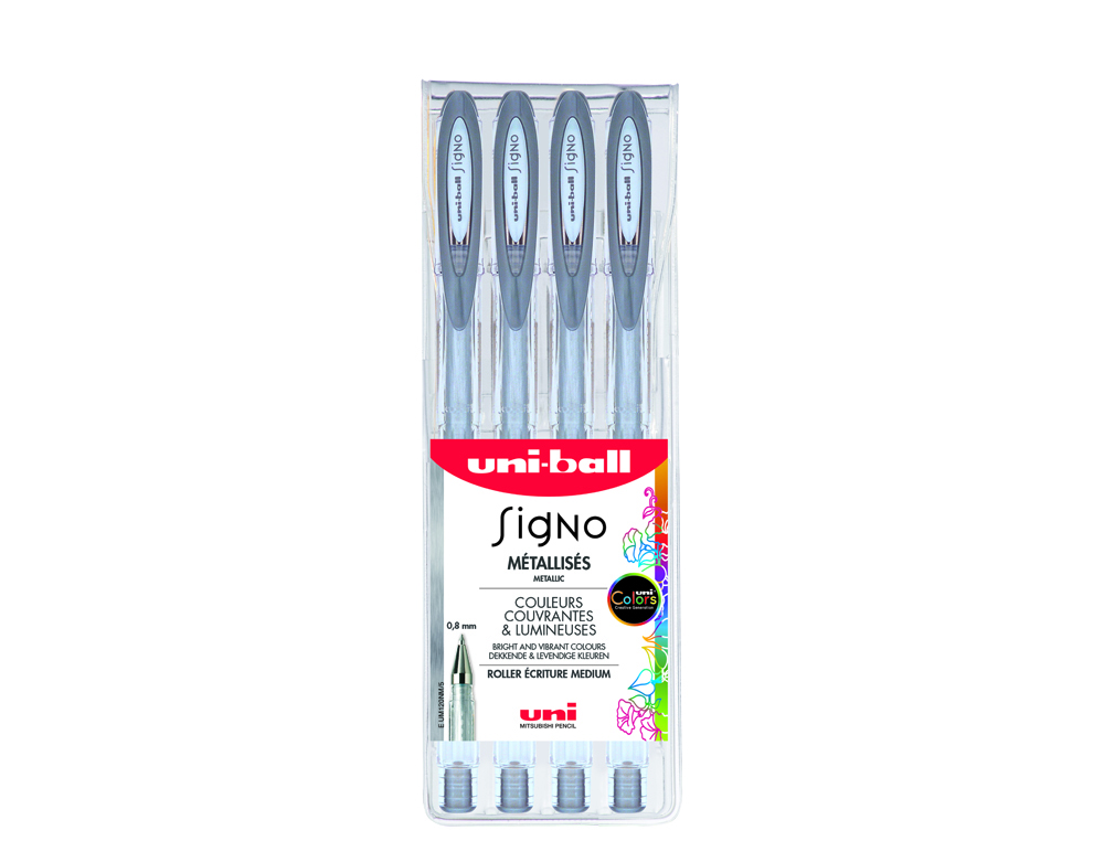 Roller uniball signo encre gel resistant pointe moyenne trace 0,7mm coloris metallise or pochette de 4un