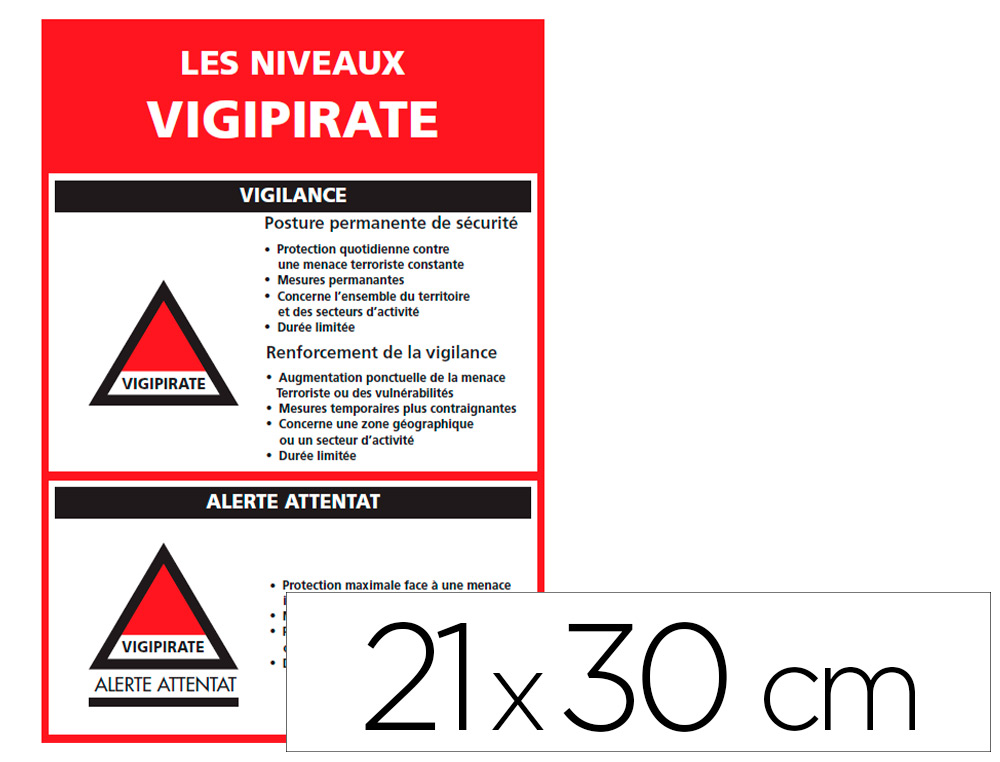Assurez la sécurité de vos espaces avec ce panneau de signalisation adhésif Vigipirate. Conçu pour alerter le public en cas de menace, ce panneau s'intègre parfaitement dans le dispositif français de lutte contre le terrorisme, garantissant que tous restent vigilants et informés des consignes à suivre.